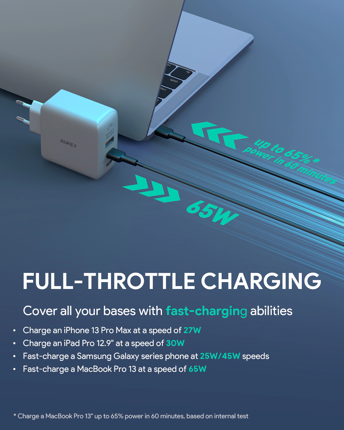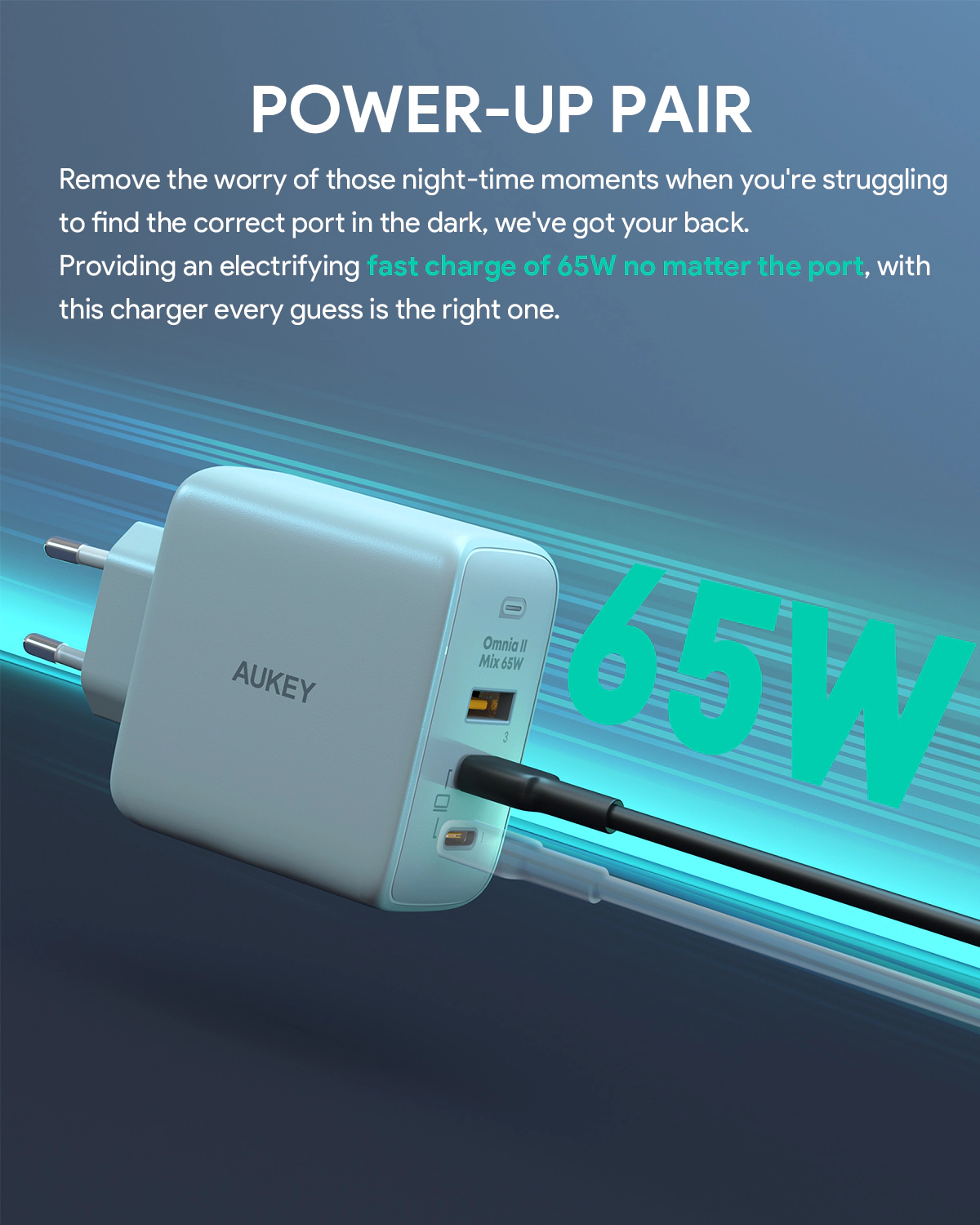 AUKEY PA-B6T หัวชาร์จเร็ว Power Tech รองรับ iPhone/Android/Laptop เทคโนโลยี PD3.1 ขาปลั๊กสามารถพับเก็บได้ กระทัดรัด น้ำหนักเบา พกง่าย เพิ่มความเร็วในการชาร์จสูงสุดที่ 65W ด้วยช่อง USB-C Power Delivery 3.0 เพียงช่องเดียว