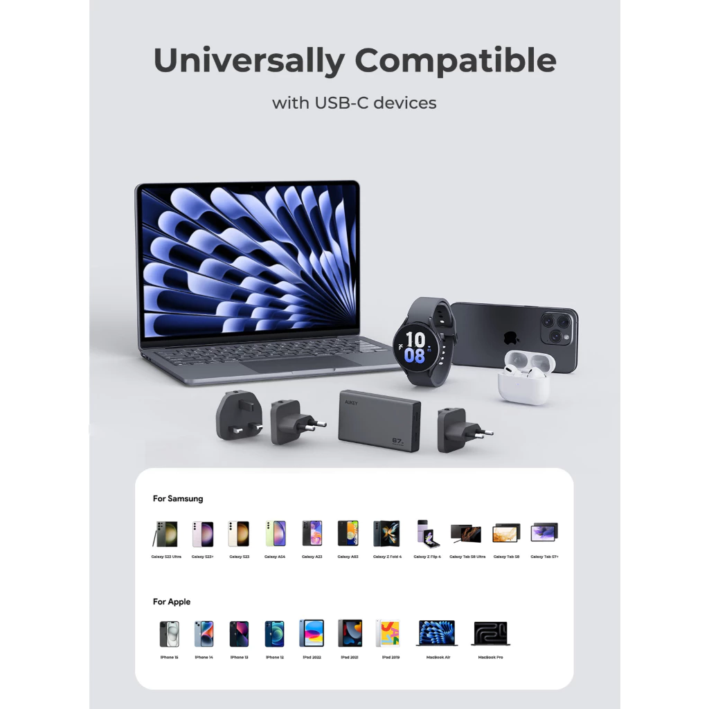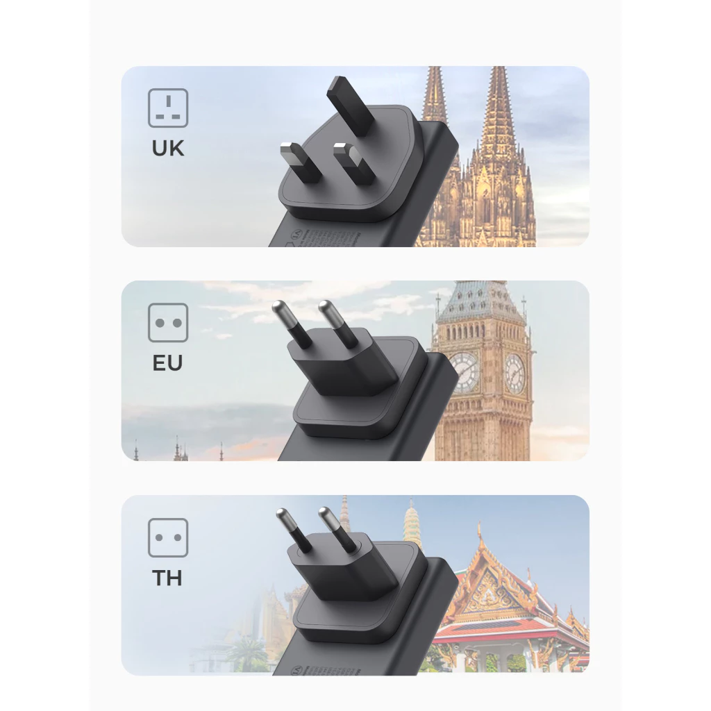 มาพร้อมหัวปลั๊กแบบเปลี่ยนได้ทั้ง EU, UK และ TH รองรับการใช้งานในหลายประเทศทั่วโลก เหมาะสำหรับผู้ที่เดินทางระหว่างประเทศบ่อย ๆ