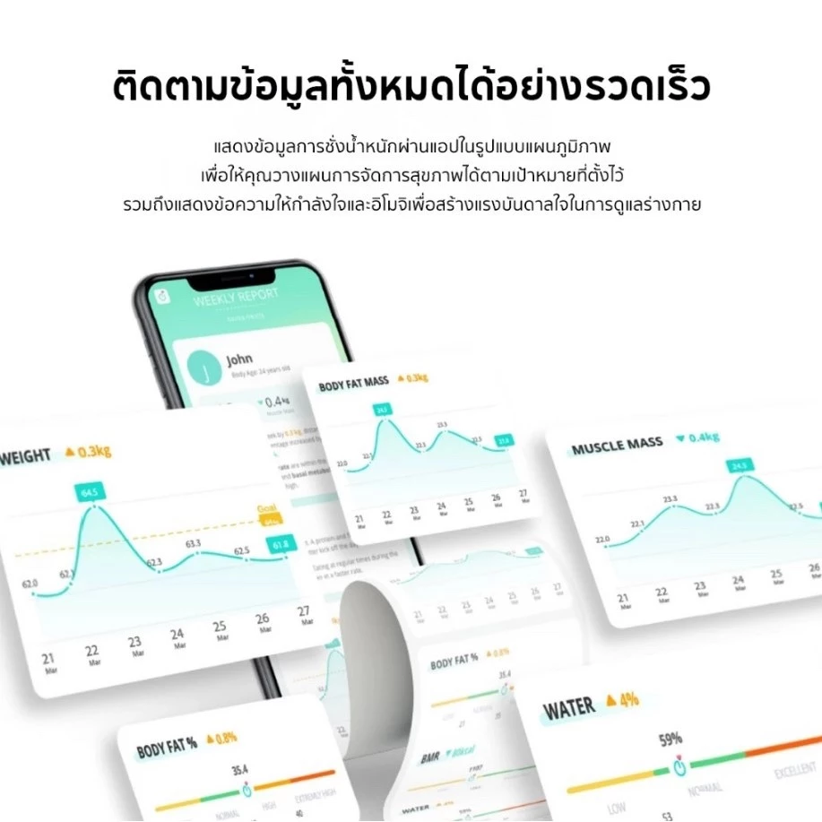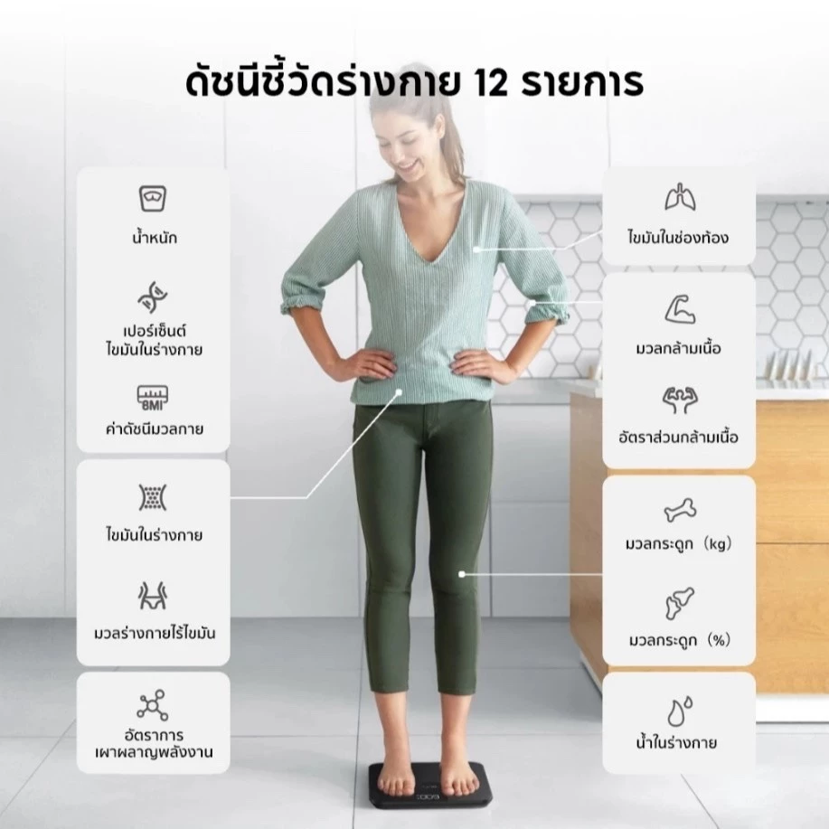 เครื่องชั่งน้ำหนักดิจิตอลคุณภาพดี ที่ผลิตจากวัสดุคุณภาพดี สามารถวัดค่าสุขภาพ 17 รายการ สามารถวัดไขมันในร่างกาย,BMI,การวิเคราะห์องค์ประกอบของร่างกายในการออกกำลังกาย ชั่งน้ำหนักได้อย่างง่ายดาย และละเอียดแม่นยำ ดีไซน์สวย มีน้ำหนักเบา เคลื่อนย้ายง่าย นอกจากนั้นยังประหยัดพื้นที่ในการจัดเก็บ
