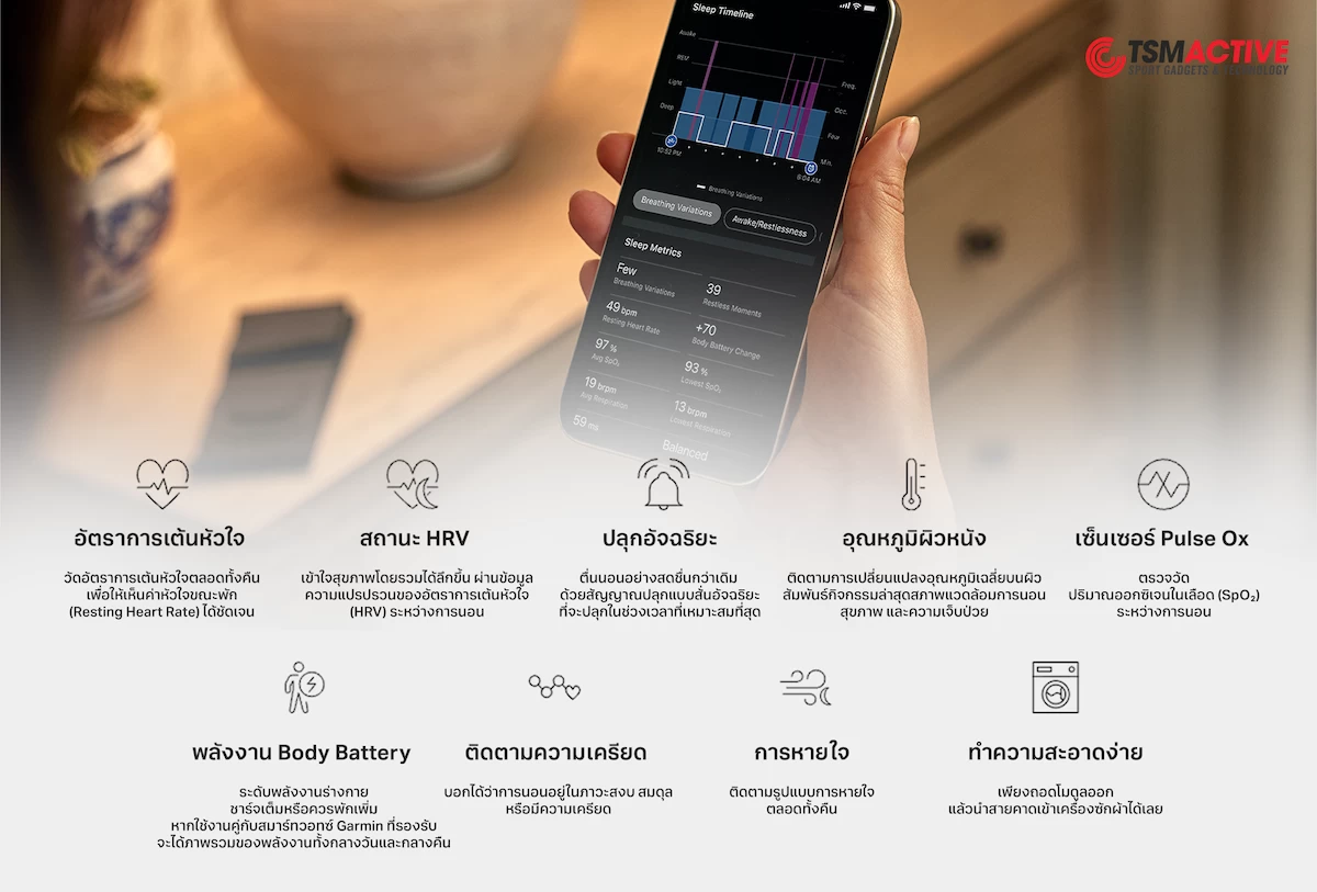 เพื่อข้อมูลสุขภาพที่ลึกยิ่งขึ้น ฟีเจอร์ตรวจวัดความแปรปรวนของการหายใจขณะหลับจะใช้เช็นเชอร์ Puise Ox