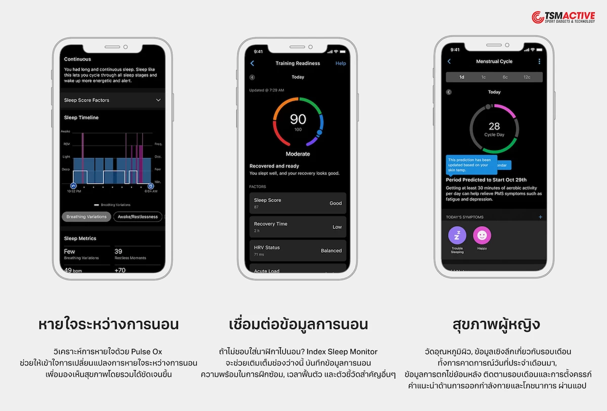 ติดตามข้อมูลการนอนหลับ ได้อย่างหลากหลาย รวมถึงคะแนนการนอนหลับ ระยะของการนอน สถานะ HRV(ตัวแปรของอัตราการเต้นของหัวใจ) และระยะเวลาการพักผ่อน (ข้อมูลที่แสดงเป็นการประมาณค่าใกล้เคียงจากการติดตามจริง)